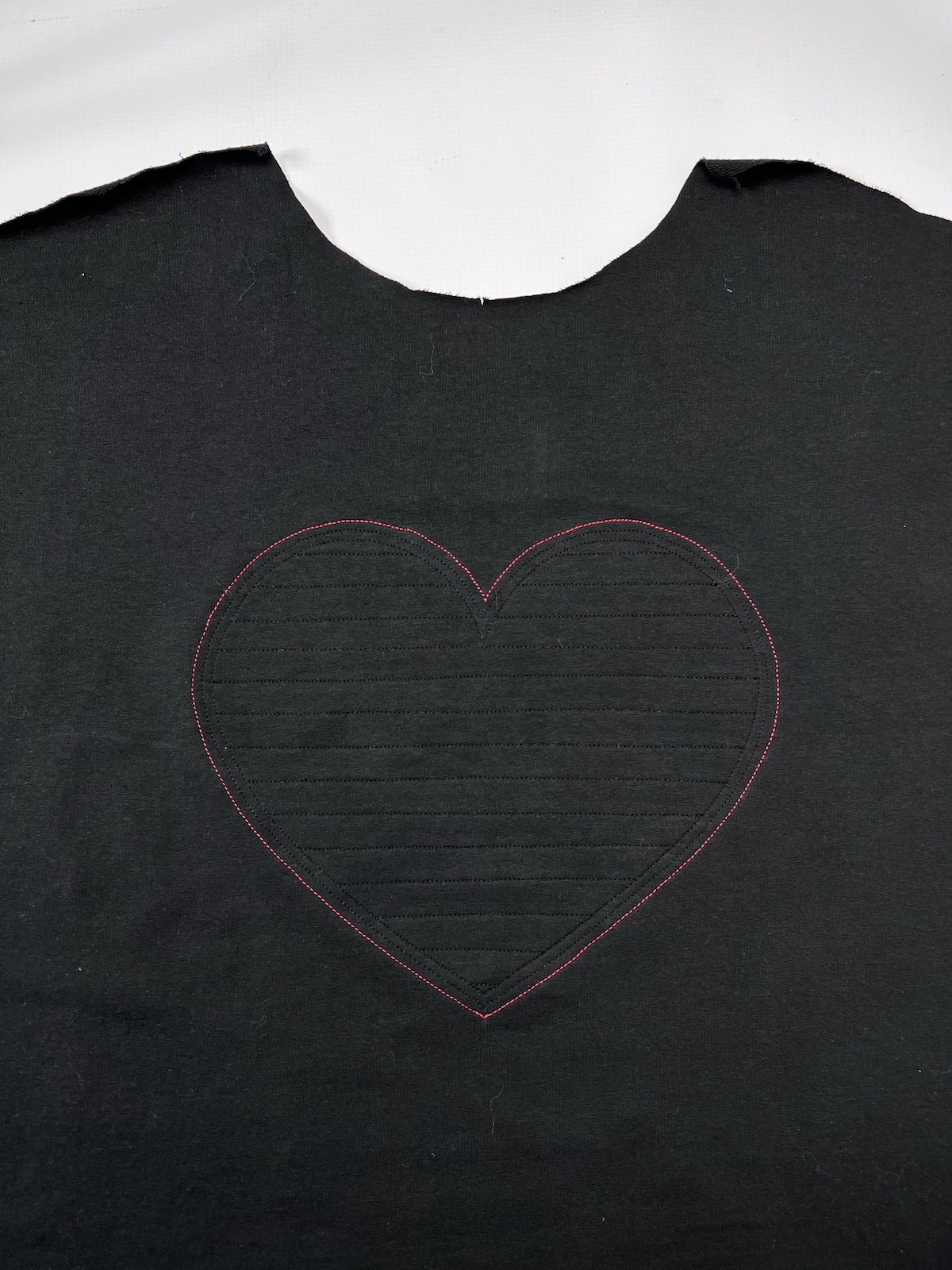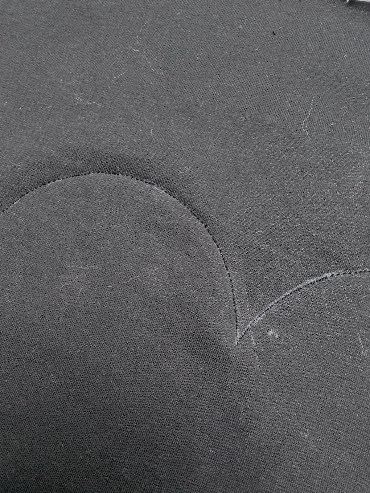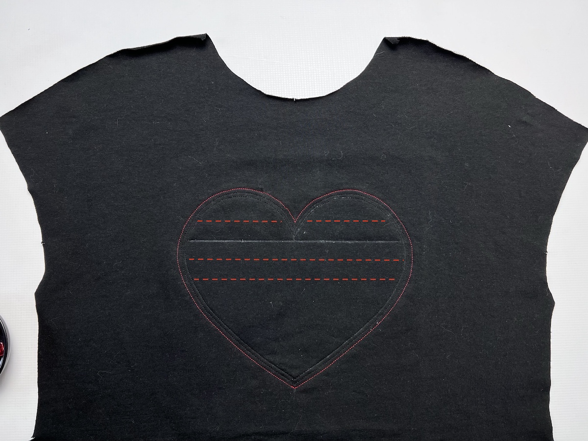 11. Ponownie użyjemy mydełka / flamastra. Rysujemy pierwszą linię, po której będziemy stębnować. Kolejne linie możemy również wrysować, możemy też odmierzać odległości stopką podczas szycia. Odległości między liniami to 1-1,5cm (np. bluza czarna 1,5cm, bluzeczka ecru 1cm)