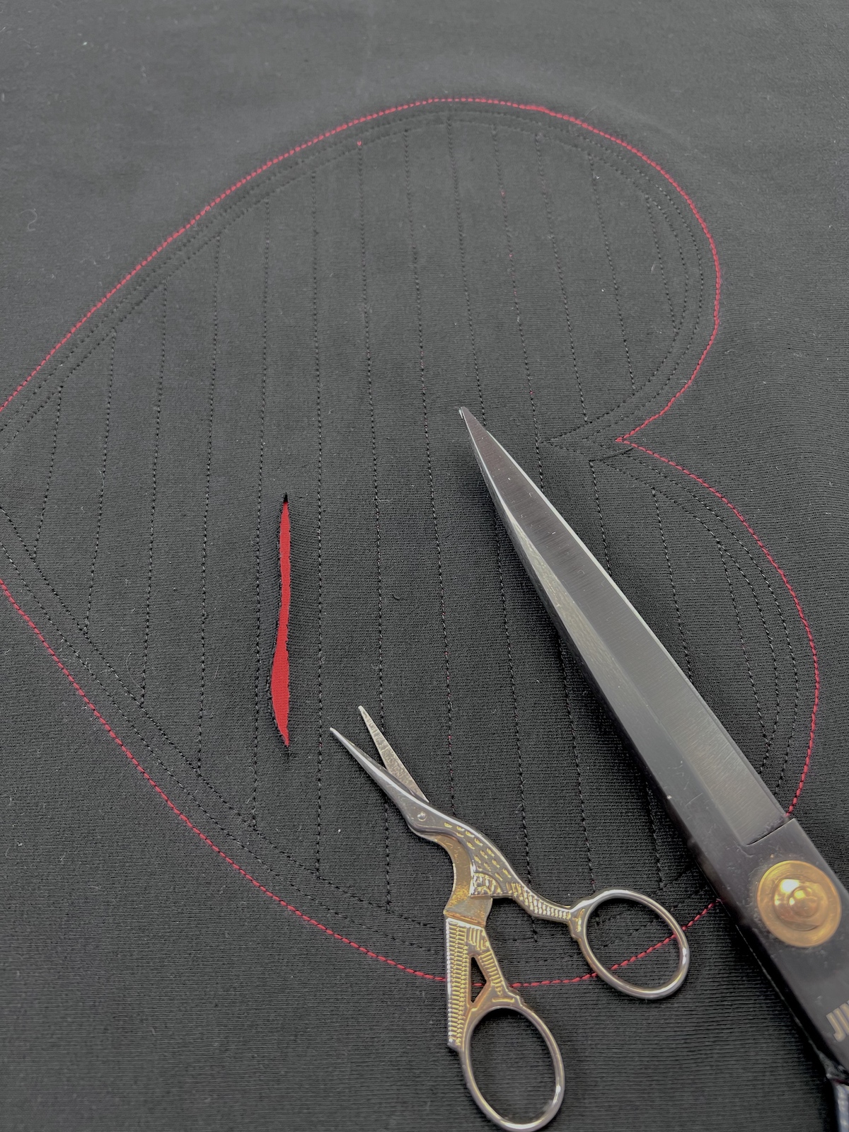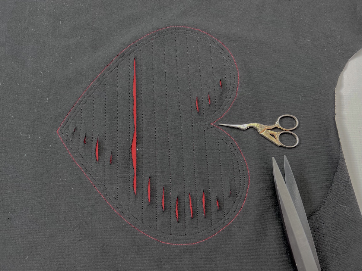 14. Etap końcowy  - tworzymy nacięcia dokładnie na środku pomiędzy równoległymi przeszyciami. Tniemy ostrożnie i powoli, uważamy, aby nie przeciąć materiału spodniego!