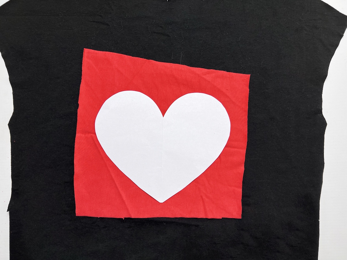 1. Wycinamy przód bluzy. Dokładnie prasujemy materiał, aby pozbyć się wszystkich zagnieceń. Wycinamy również kształt aplikacji (można narysować coś samemu lub znaleźć szablon w internecie)