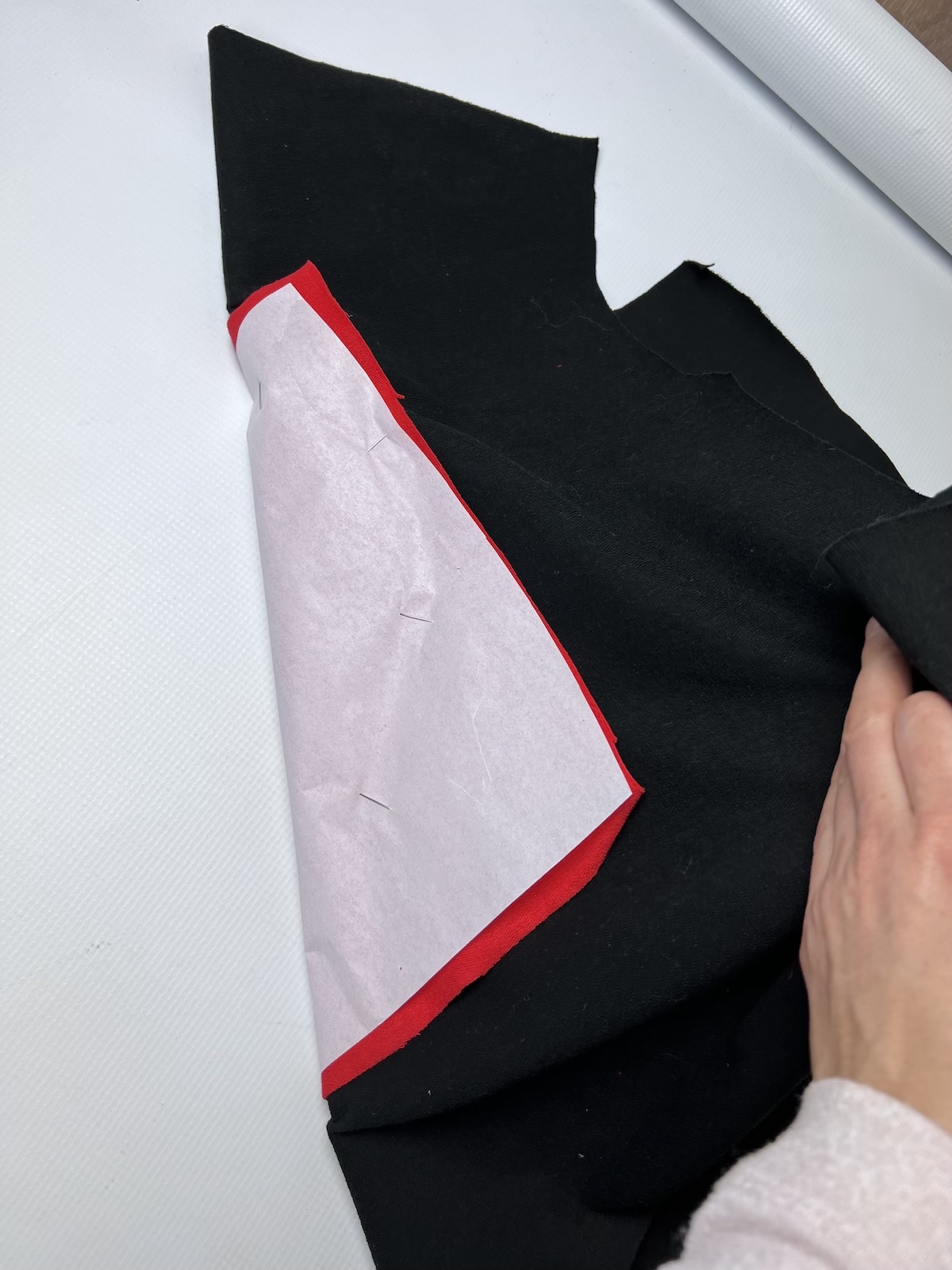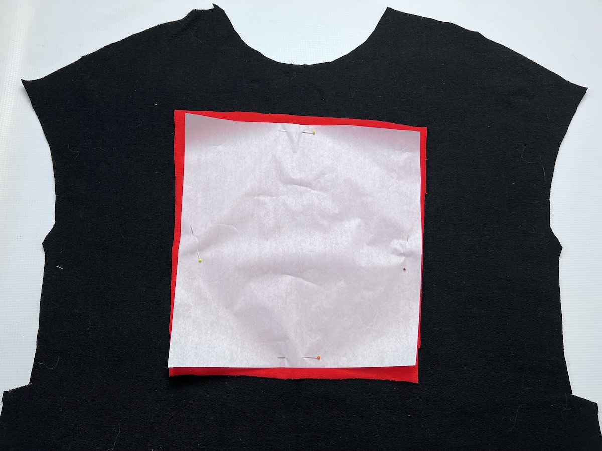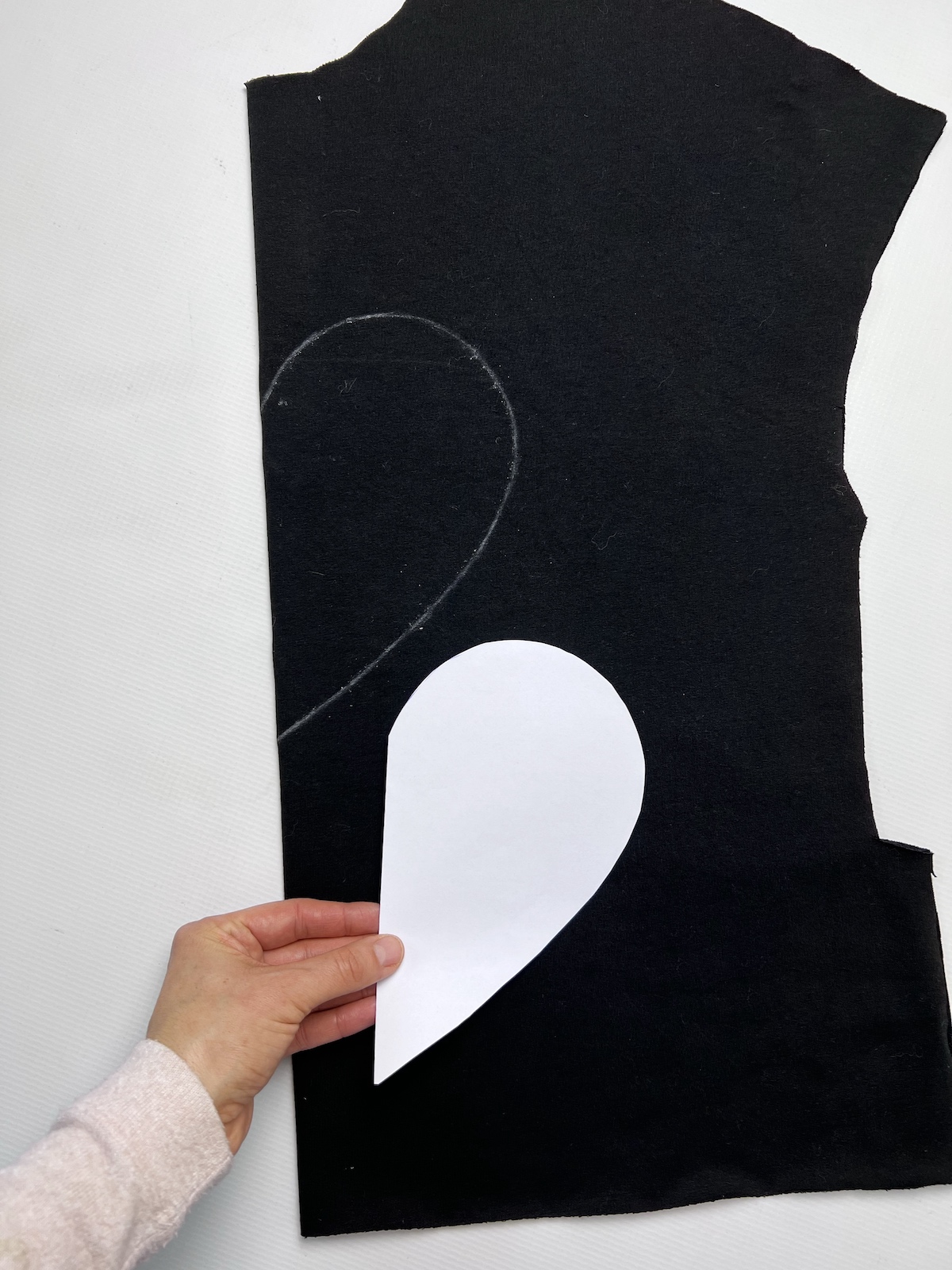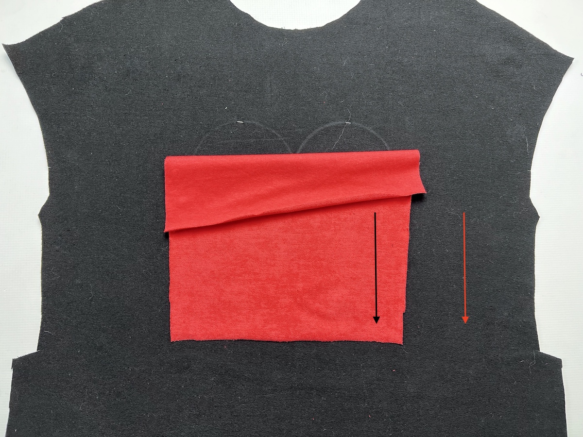 6. Wycięty materiał spodni przykładamy prawą strona do lewej strony bluzy. Pilnujemy, aby obie warstwy ułożone były w tym samym kierunku