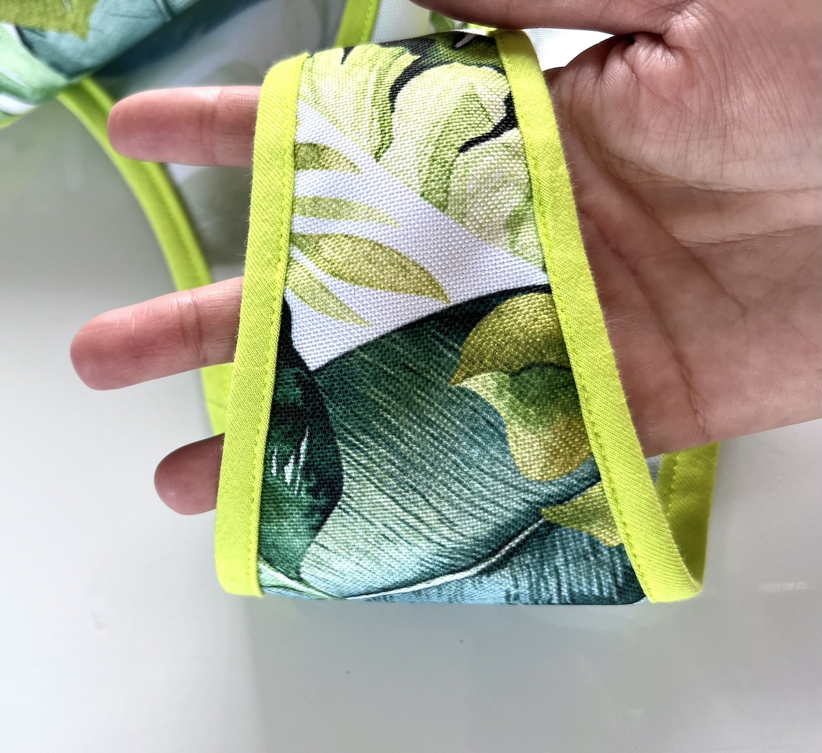 - Ostatni etap to obszycie całości lamówką - krawędzie tworzą zamkniętą linię dlatego obszywamy całość jednym kawałkiem taśmy