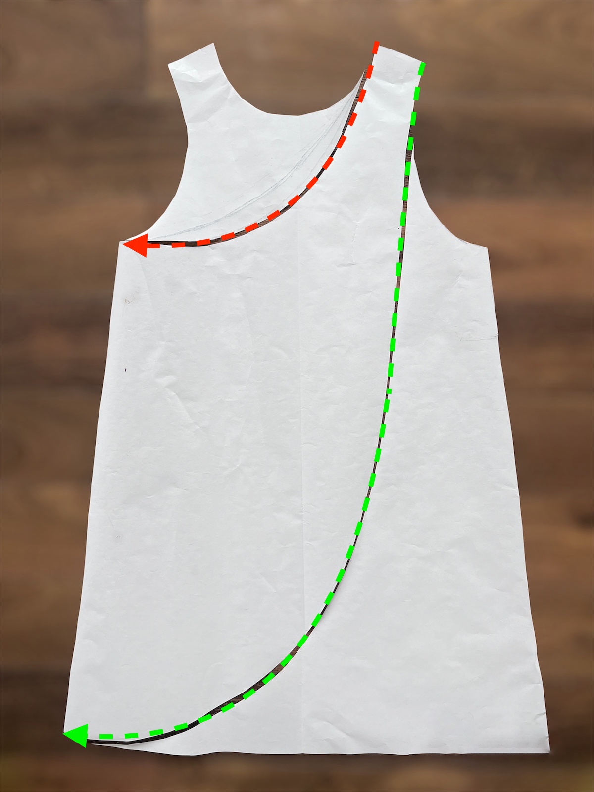 - Bluzeczka, od której odrysowaliśmy kształt miała niewielki podkrój pachy. Aby łatwiej było zakładać fartuszek podkrój pachy należy powiększyć