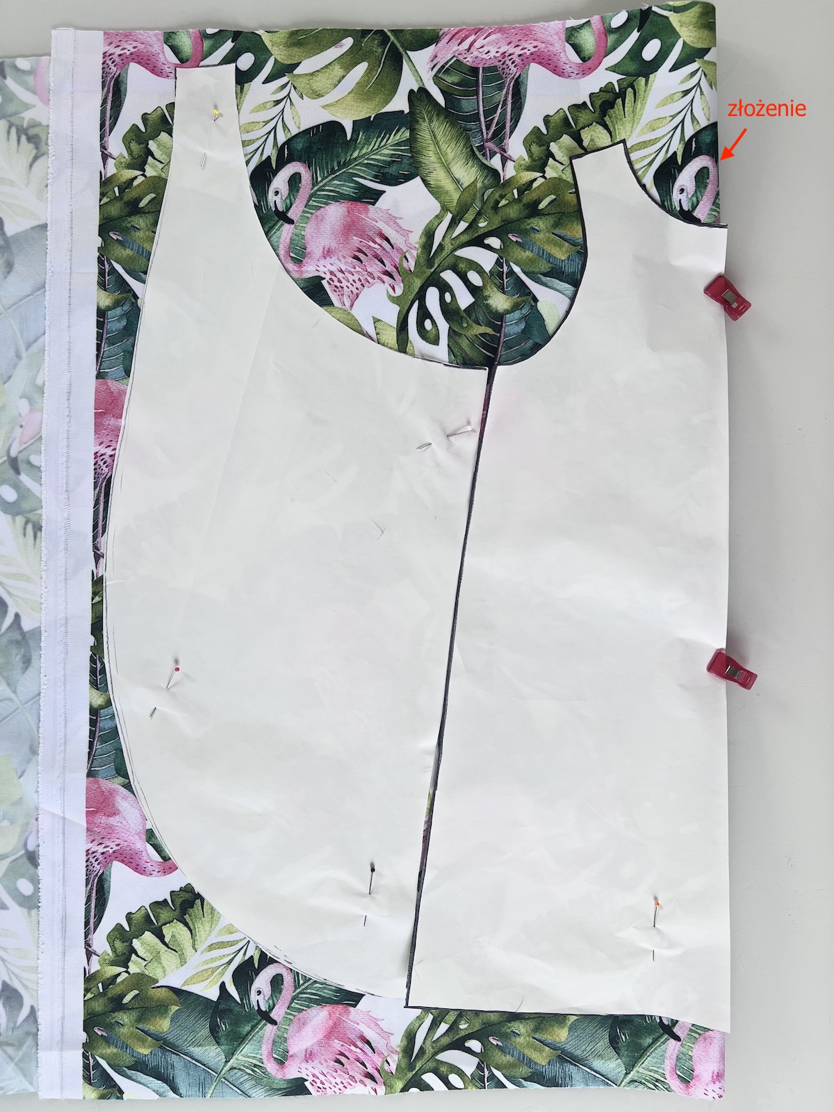 - Szablon przypinamy do złożonego materiału