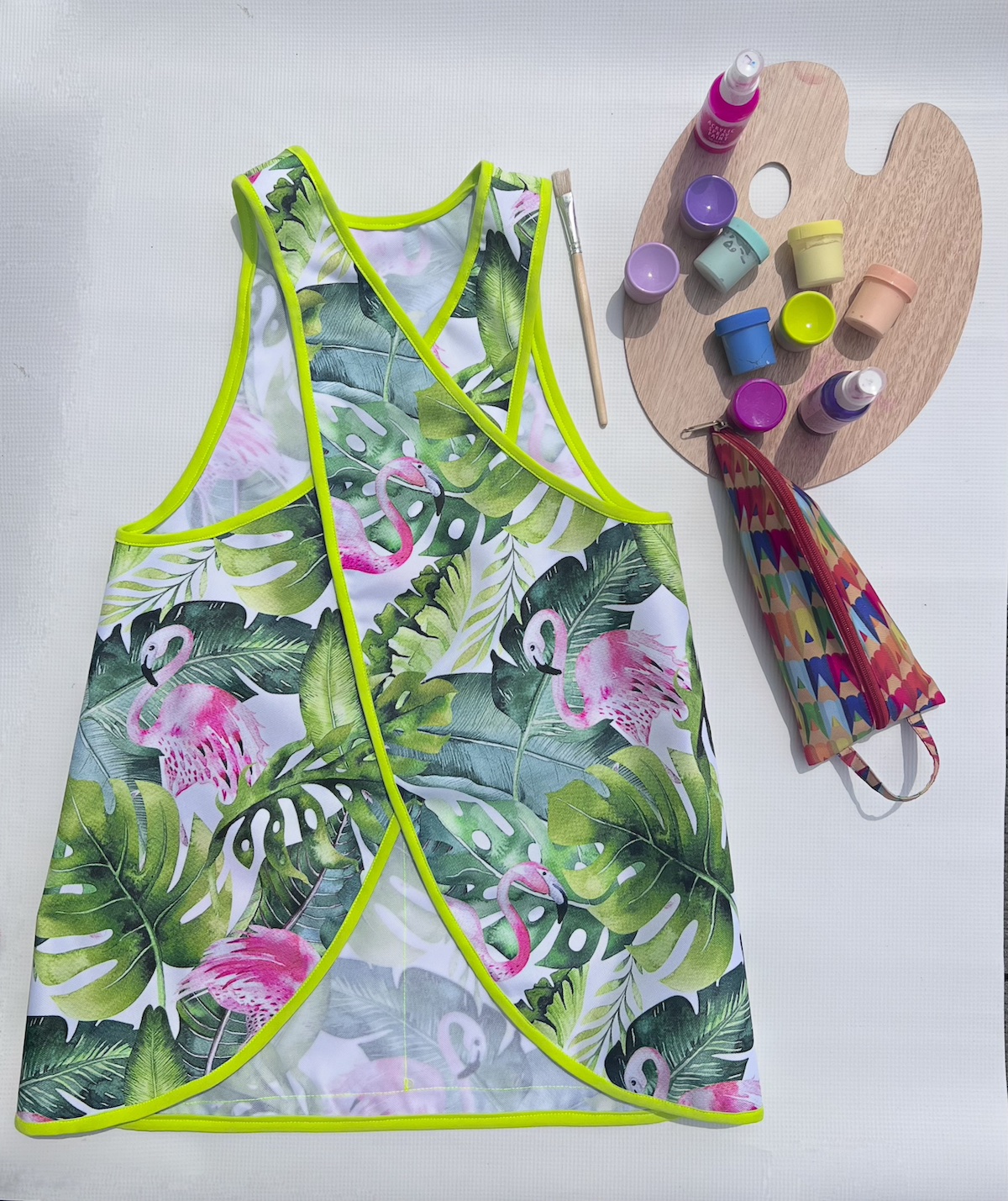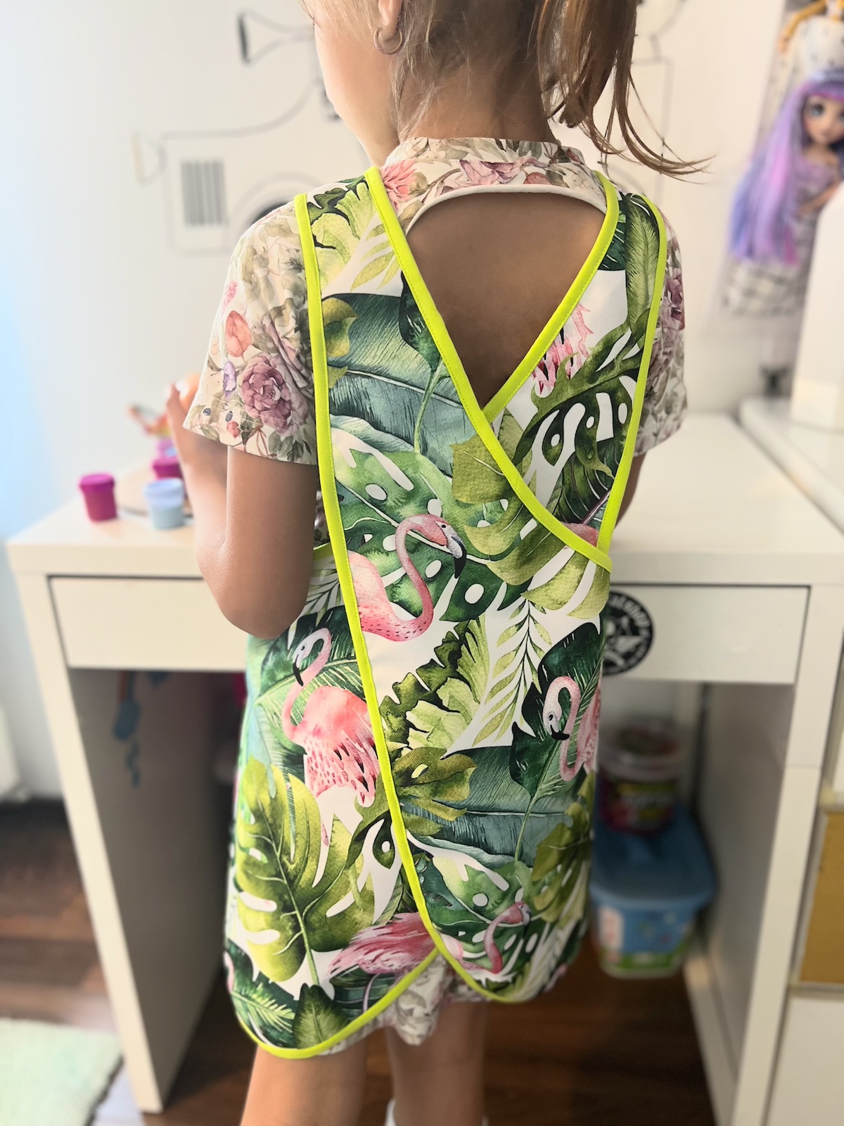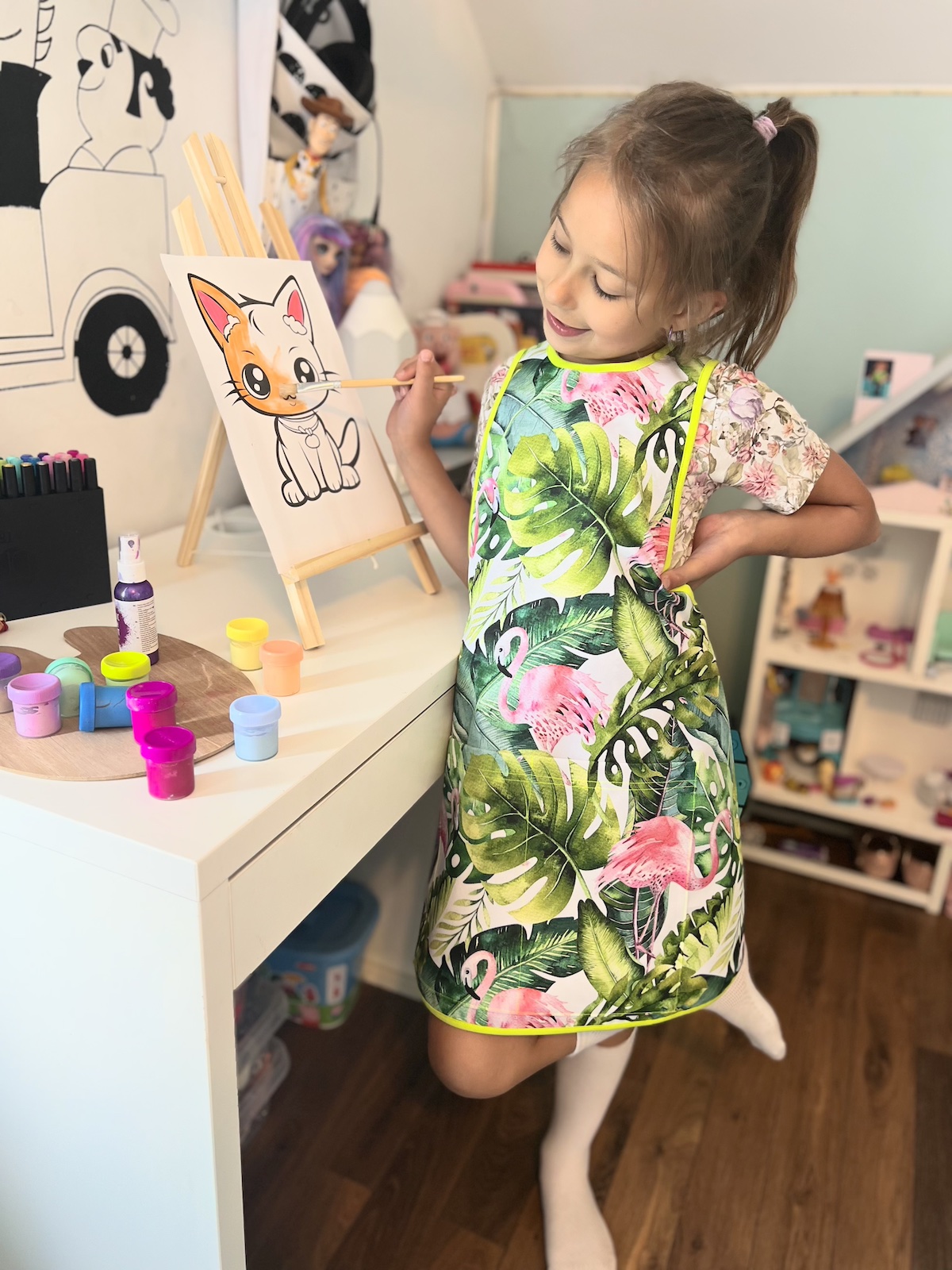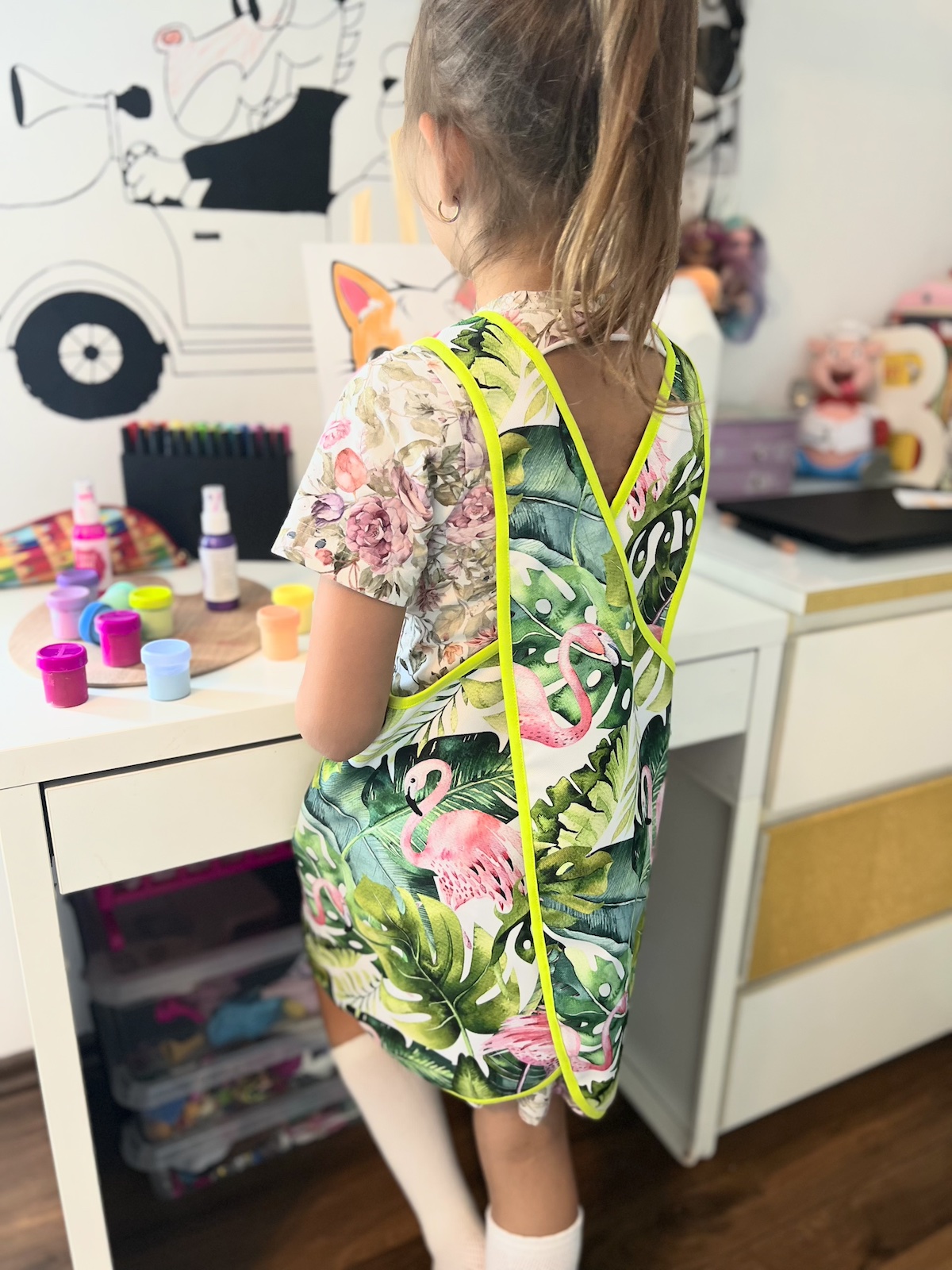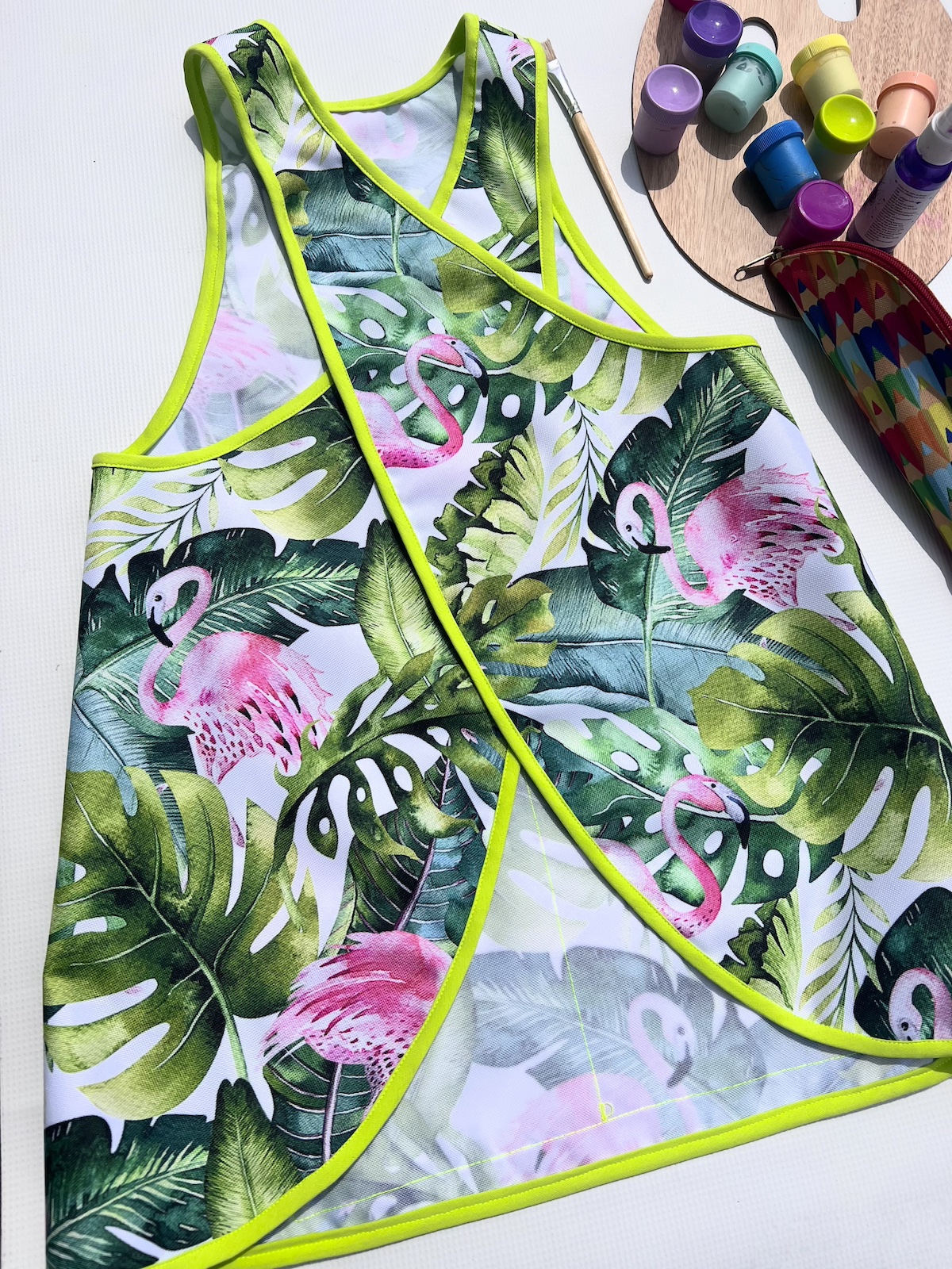 Kolorowy fartuszek, w zależności od wzoru, będzie bardzo przydatny dla małych artystów podczas malowania, przyda się również małym majsterkowiczom oraz tym, którzy próbują swoich sił w kuchni ;) Fartuszek ma z przodu funkcjonalną kieszonkę, nie ma żadnych zapięć czy wiązań, dzięki czemu dzieciaki szybko same go założą. Zapraszamy!