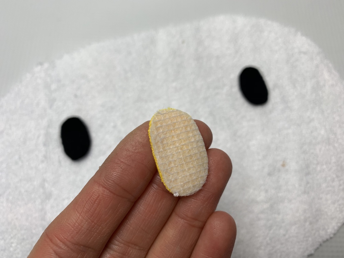 10. Jeśli na pokrowcu mają znaleźć się jakieś aplikacje, należy wykonać je teraz. Mój termofor ma kształt główki Hello Kitty, dlatego potrzebowałam czarnych oczek i żółtego noska. Elementy te wycięłam ze zwykłej dresówki