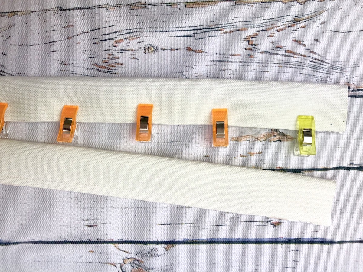 2. Paski składamy wzdłuż długiego brzegu, przeszywamy blisko krawędzi