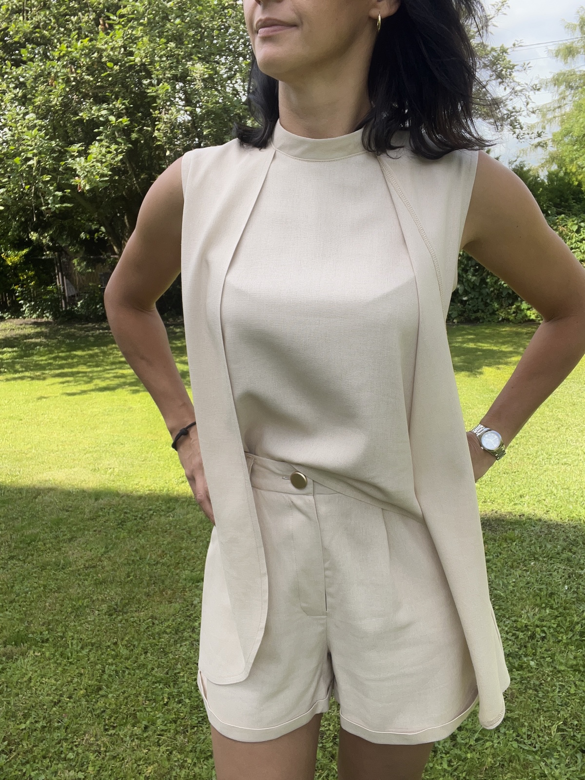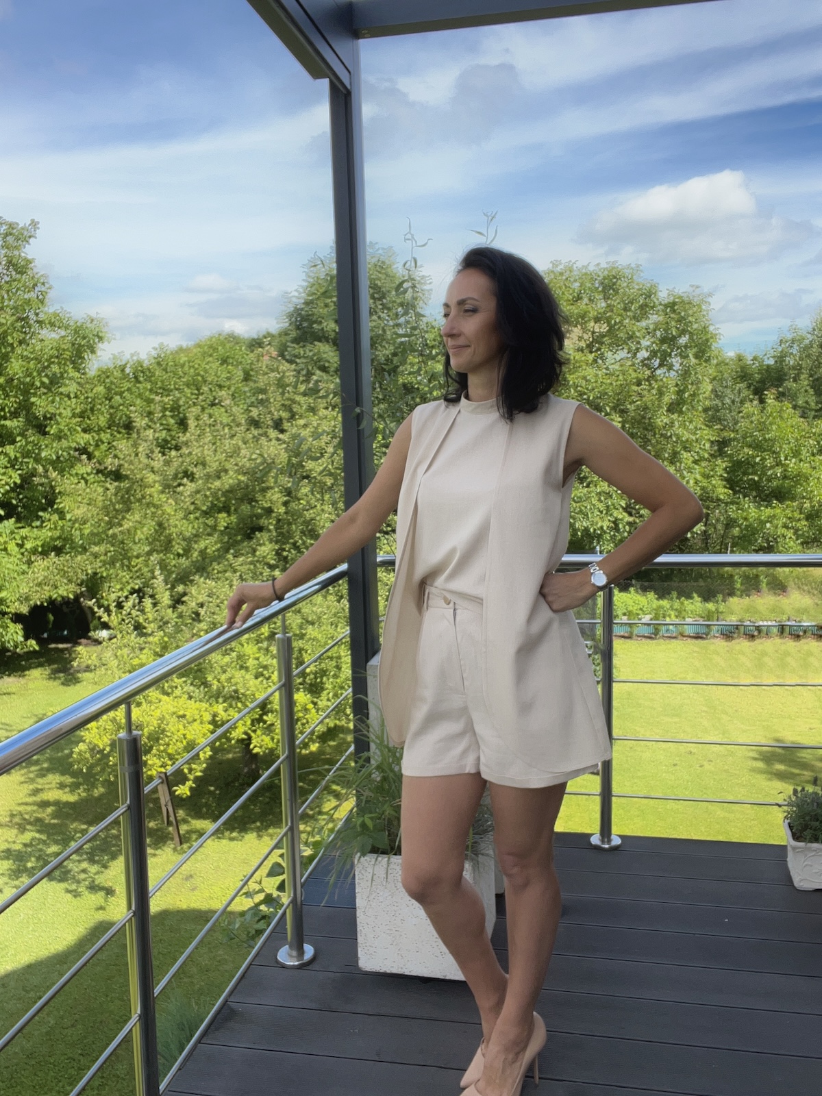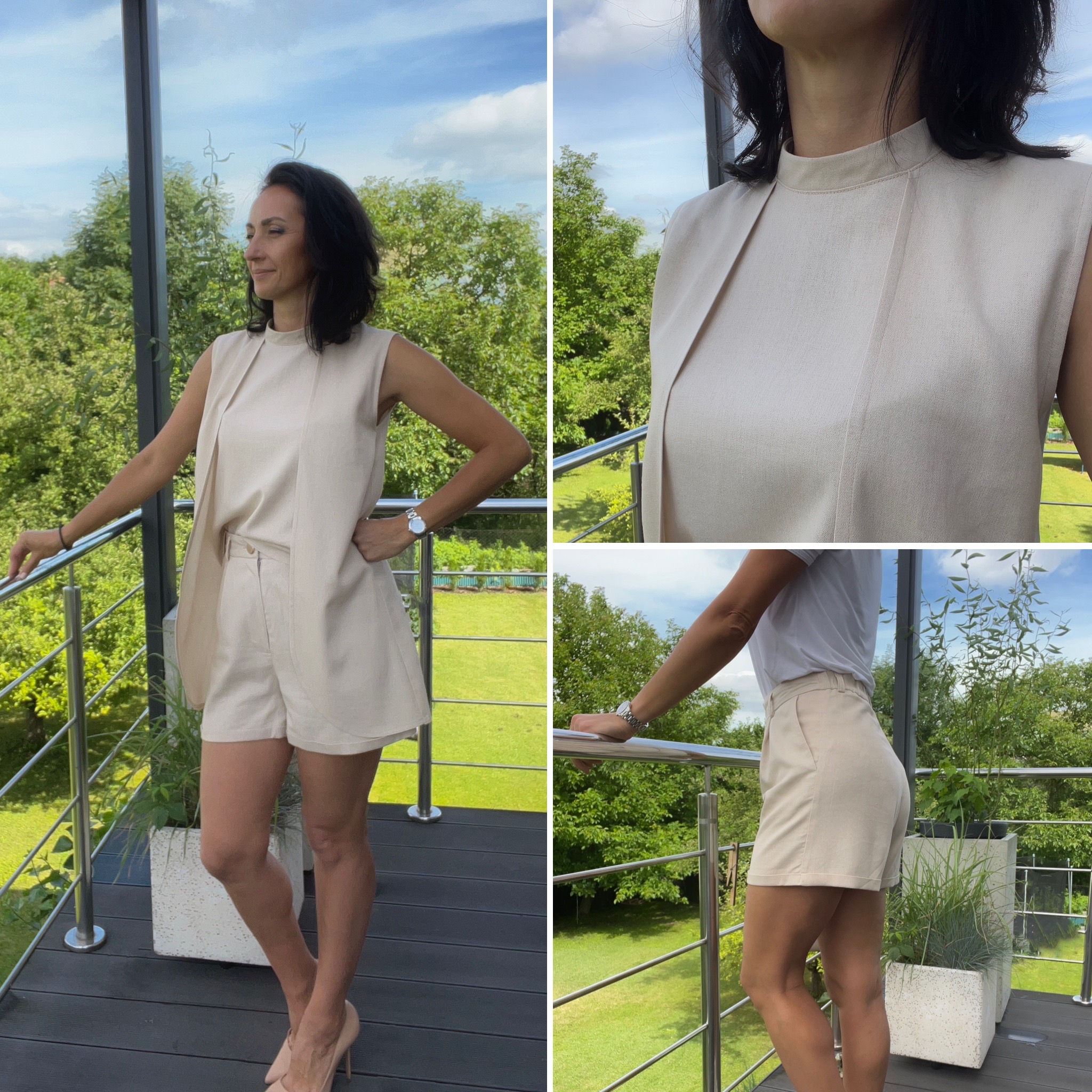 Piękny, niepowtarzalny set Victoria składa się z bluzeczki i spodenek. Luźna bluzka ze stójką ma oryginalny krój - z przodu jest krótsza, boki i tył w stylu „narzutki” są nieco dłuższe. Krótkie spodenki z zakładkami posiadają kieszenie i zapinane są na zamek z guziczkiem. Set możecie nosić razem lub osobno. Sprawdzi się zarówno na co dzień jak i na specjalne okazje.